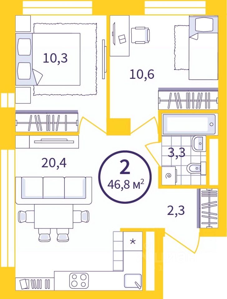Двухкомнатная квартира от застройщика в ЖК "Астон.Сезоны" на 1 этаже. Квартира без отделки, полностью готова к ремонту. Общая площадь: 46.83 кв.м., жилая: 20.9 кв.м., площадь просторной кухни-столовой: 20.4 кв.м. Квартира угловая, очень светлая, естественная вентиляция при открытии окон. В квартире один совмещенный санузел. Высота потолков 2.7 м.