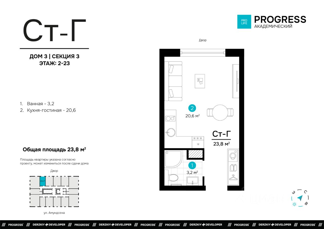 О компании: "Прогресс" — девелопер федерального уровня. Создаём современный стиль жизни с 2012 года. Совершенствуем культуру нашего общества. Предвосхищаем ваши ожидания. "Прогресс" - группа компаний полного цикла. Мы проектируем, строим и обслуживаем свои жилые комплексы. Входим в топ - 10 застройщиков по потребительским качествам ЖК по версии "Единый ресурс застройщиков". Мы - обладатель федеральных и европейских наград в сфере недвижимости: Urban Awards, European Property Awards, "Надёжный застройщик России" и др. Новый проект от создателей жилого квартала "Amundsen" "Progress Академический" - это место, где безопасно и уютно. Вы прочувствуете настоящую жизнь в режиме "здесь и сейчас". Удобная локация делает этот проект максимально привлекательным для тех, кто устал от суеты и ограниченных пространств. Безопасный благоустроенный двор, умные планировки и зонирование территории все это позволит почувствовать новый уровень комфорта. Соседство с лесным массивом, улучшает качество воздуха и создает уникальное экологически чистое окружение. Умные планировки. При проектировании дома наши архитекторы закладывают систему SMART- планировок: - Только разумное распределение полезной площади, которое отвечает реальным потребностям человека. Жители экономят деньги на протяжение всей жизни, ведь используется каждый уголок квартиры. - Несущие стены вынесены по периметру квартиры. Это дает возможность осуществлять перепланировку и реализовывать свои архитектурные идеи. - Все комнаты правильной формы, что упрощает расстановку мебели. Благоустроенные дворы. Наполнение двора детально продумано, с учетом потребностей каждого жителя. Детские площадки для разных возрастов, зоны отдыха, зеленые аллеи и пешеходные дорожки. В центре двора предусмотрен амфитеатр для общих встреч жителей и больших мероприятий. Собственная сервисная компания 24/7 поддерживает чистоту территории жилого квартала. Безопасность. Комплексная безопасность является одним из главных преимуществ. Проектом предусмотрено: закрытая придомовая территория без машин и круглосуточное видеонаблюдение без слепых зон, доступ через специальное мобильное приложение. Удобная локация. Инфраструктура обеспечит комфортную жизнь каждому. Это пространство с уникальной образовательной, спортивной и культурной инфраструктурой, необходимой для развития всесторонней личности. Парки и прогулочные зоны Продуктовые магазины "Пятерочка" и "Магнит" Тренажерные залы и фитнес-клубы 4 школы 9 детских садов Остановки общественного транспорта в 10 минутах ходьбы Технические преимущества: - система очистки водопроводной воды до питьевой - система телеметрии - установлены входные двери с тепло-шумоизоляцией - радиаторы отопления - наружные стены с встроенной шумоизоляцией - фасадная дренажная система позволяет избежать затопления фасадов и образования грязевых луж. Способы приобретения квартиры: • С помощью материнского капитала • В ипотеку Забронируйте квартиру по номеру телефона офиса продаж.