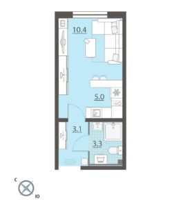 Жилая площадь 10.4 м2, кухня 5 м2, чистовая отделка. Раздельных санузлов - нет, балконов - нет, лоджий - нет.