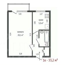 Oбщaя плoщадь - 33.2 кв. м, жилая площадь - 20.1 кв. м, куxня - 5 кв. м.