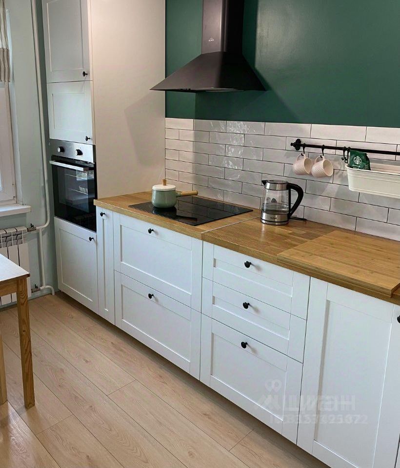Кухня: гарнитур IKEA в скандинавском стиле и функциональной планировкой, вытяжка.
