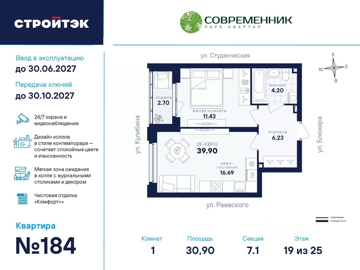Время жить счастливо Современник — знаковый парк-квартал в интеллигентном районе Втузгородок, откуда недалеко до центра, а вблизи ведущие вузы и театры. Квартал состоит из 8 очередей строительства. Шесть очередей уже сданы и заселены; седьмая строится. В продаже квартиры от застройщика: 1 этап строящейся 7-й очереди. Объединяет квартал большой внутренний парк площадью в гектар — богатый прогулочными маршрутами, тенистыми деревьями, пространствами для отдыха, спорта и детских игр. С внешней стороны, у домов седьмой очереди, появится гостевой центр. Проект создавали в KCAP Architects and Planners, архитектурном бюро из Нидерландов, чьи работы украшают ландшафты Гамбурга, Антверпена и других городов Европы. Современные технологии, продуманное пространство и трендовый облик зданий создают размеренную атмосферу для жизни здесь. Достойное окружение До проспекта Ленина на машине вы доберётесь за 10 минут, а с другой стороны, неподалёку — Шарташский лесопарк с озером Шарташ, которому около миллиона лет. Здесь для вас пляжи, лодочные станции, тропы для бега и кафе. В квартале уже работают супермаркеты, пекарни, салон красоты и не только. Ближние школы, гимназии и университеты помогут расправить крылья новым поколениям, а детские сады станут заботливой средой в начале пути. Кстати, на территории квартала спроектирован муниципальный детский сад на 200 мест. Выходите во двор Гуляйте по зелёным аллеям или устройтесь с книгой в гамаке. Займитесь воркаутом, футболом, баскетболом или пинг-понгом. Проводите семейные праздники под крытым амфитеатром или отправьте детей весело играть на насыщенный плейхаб. Мы всё предусмотрели. На закрытой территории без машин и посторонних спокойно и безопасно. Видеонаблюдение и освещение добавляют ещё больше уверенности. Впечатляющая доминанта у домов 7 очереди — новый гостевой центр: камерное пространство под навесом-перголой с озеленением и скамейками, чтобы встречать друзей. Ваша зона комфорта Стильное лобби Современника мы выполним в эстетике contemporary: минимализм, сочетание дерева со штукатуркой и тёмным металлом, зеркала, витражи. Обстановка из мягкой мебели, растений и книг. Двери из холла выходят на обе стороны. Внутри — комната для колясок и самокатов. На -1 этаже подземный паркинг с 201 машино-местом, куда легко попасть на лифте прямо с вашего этажа. Здесь же можно приобрести одну из 67 кладовых, чтобы хранить сезонный инвентарь. СТРОЙТЭК возводит 7 очередь в 3 этапа. Дом с привилегиями Первый этап — секция 7.1, башня в 25 этажей. Здесь 246 квартир в 19 уникальных планировках от студий до 3-комнатных, в классических и евро-вариантах. Просторные кухни-гостиные, гардеробные и окна на 2 стороны — лишь часть их плюсов. В Современнике улучшенный стандарт отделки "Комфорт +". Помимо комфортных сантехники и электрики, в него входят оконные стёкла Energy Light, которые помогают сохранять температуру, прочный ламинат 33 класса и устойчивые к многократной покраске виниловые обои. Белые межкомнатные двери и плинтусы подчеркнут
