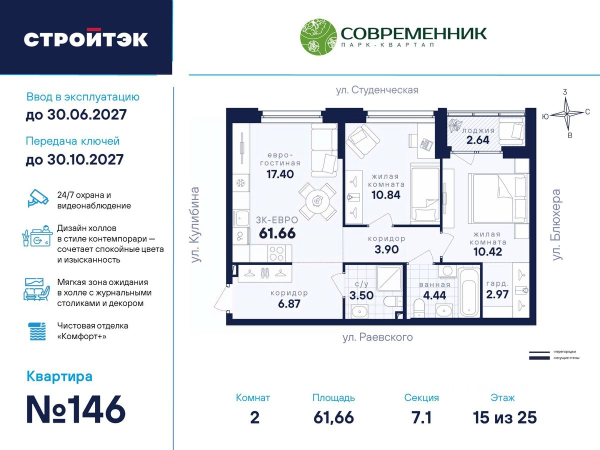 Время жить счастливо Современник — знаковый парк-квартал в интеллигентном районе Втузгородок, откуда недалеко до центра, а вблизи ведущие вузы и театры. Квартал состоит из 8 очередей строительства. Шесть очередей уже сданы и заселены; седьмая строится. В продаже квартиры от застройщика: 1 этап строящейся 7-й очереди. Объединяет квартал большой внутренний парк площадью в гектар — богатый прогулочными маршрутами, тенистыми деревьями, пространствами для отдыха, спорта и детских игр. С внешней стороны, у домов седьмой очереди, появится гостевой центр. Проект создавали в KCAP Architects & Planners, архитектурном бюро из Нидерландов, чьи работы украшают ландшафты Гамбурга, Роттердама, Антверпена и других городов Европы. Современные технологии, продуманное пространство и трендовый облик зданий создают размеренную и счастливую атмосферу для жизни здесь. Достойное окружение До проспекта Ленина на машине вы доберётесь за 10 минут, а с другой стороны, неподалёку — Шарташский лесопарк с озером Шарташ, которому около миллиона лет. Здесь для вас пляжи, лодочные станции, тропы для бега, спортивные площадки и кафе. В квартале уже работают супермаркеты, пекарни, салон красоты и не только. Ближние школы, гимназии и университеты помогут расправить крылья новым поколениям, а детские сады станут заботливой средой в начале пути. Кстати, на территории квартала спроектирован муниципальный детский сад на 200 мест. Выходите во двор Гуляйте по зелёным аллеям или устройтесь с книгой в гамаке. Займитесь воркаутом, футболом, баскетболом или пинг-понгом. Проводите семейные праздники под крытым амфитеатром или отправьте детей весело играть на насыщенный плейхаб. Мы всё предусмотрели. На закрытой территории без машин и посторонних спокойно и безопасно. Видеонаблюдение и освещение добавляют ещё больше уверенности. Впечатляющая доминанта у домов 7 очереди — новый гостевой центр: камерное пространство под навесом-перголой с озеленением и скамейками, чтобы встречать друзей или просто коротать вечер. Ваша зона комфорта Стильное лобби Современника мы выполним в эстетике contemporary: минимализм, сочетание дерева со штукатуркой и тёмным металлом, зеркала, витражи. Обстановка из мягкой мебели, растений и книг. Двери из холла выходят на обе стороны. Внутри — специальная комната для колясок и самокатов. На минус первом этаже подземный паркинг с 201 машино-местом, куда легко попасть на лифте прямо с вашего этажа. Здесь же можно приобрести одну из 67 кладовых, чтобы хранить сезонный инвентарь и крупную технику. СТРОЙТЭК возводит 7 очередь в 3 этапа. Дом с привилегиями Первый этап — секция 7.1, отдельная башня в 25 этажей. Здесь 246 квартир в 19 уникальных планировках от студий до 3-комнатных, в классических и евро-вариантах. Просторные кухни-гостиные, гардеробные и окна на 2 стороны — лишь часть их плюсов. В Современнике улучшенный стандарт отделки "Комфорт +". Помимо привычных комфортных сантехники и электрики, в него входят оконные стёкла Energy Light, которые помогают сохранять комфортну