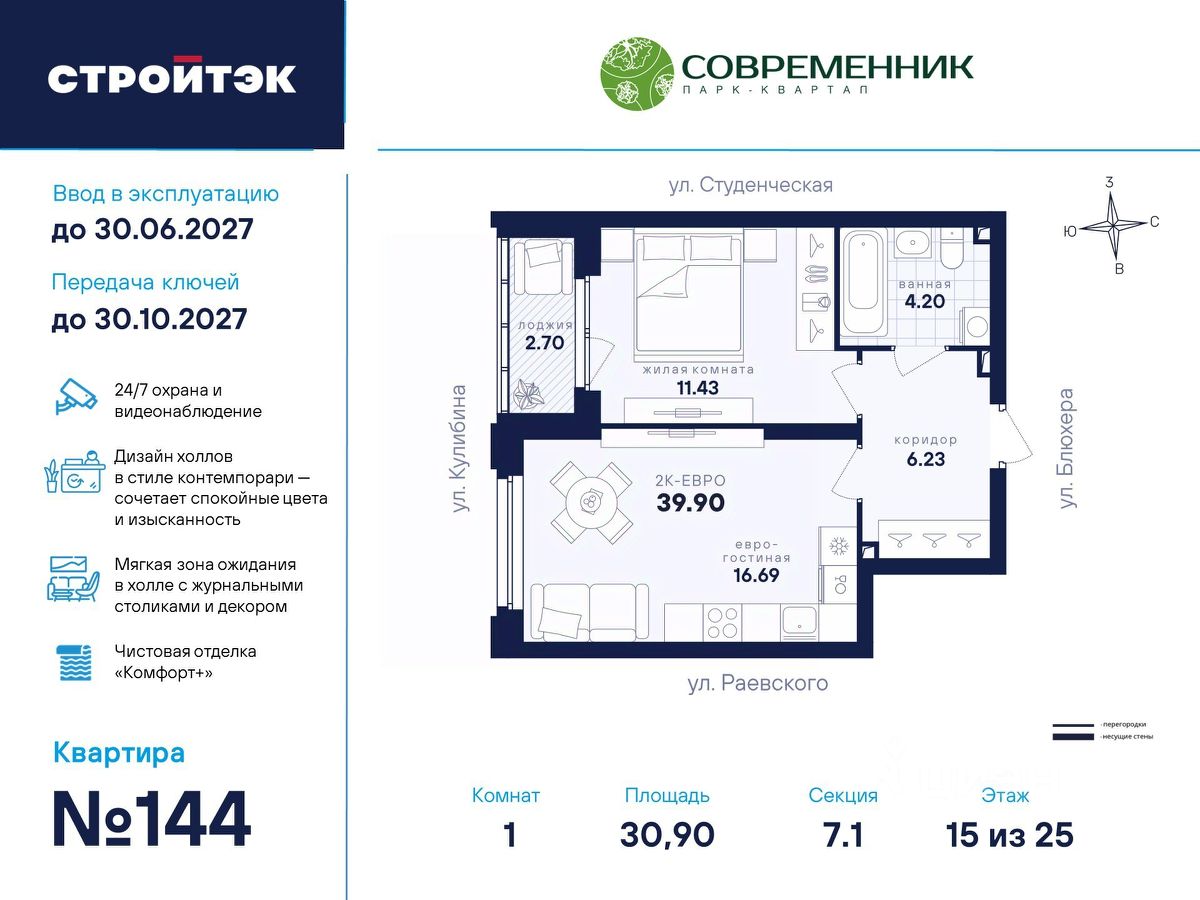 Время жить счастливо Современник — знаковый парк-квартал в интеллигентном районе Втузгородок, откуда недалеко до центра, а вблизи ведущие вузы и театры. Квартал состоит из 8 очередей строительства. Шесть очередей уже сданы и заселены; седьмая строится. В продаже квартиры от застройщика: 1 этап строящейся 7-й очереди. Объединяет квартал большой внутренний парк площадью в гектар — богатый прогулочными маршрутами, тенистыми деревьями, пространствами для отдыха, спорта и детских игр. С внешней стороны, у домов седьмой очереди, появится гостевой центр. Проект создавали в KCAP Architects & Planners, архитектурном бюро из Нидерландов, чьи работы украшают ландшафты Гамбурга, Роттердама, Антверпена и других городов Европы. Современные технологии, продуманное пространство и трендовый облик зданий создают размеренную и счастливую атмосферу для жизни здесь. Достойное окружение До проспекта Ленина на машине вы доберётесь за 10 минут, а с другой стороны, неподалёку — Шарташский лесопарк с озером Шарташ, которому около миллиона лет. Здесь для вас пляжи, лодочные станции, тропы для бега, спортивные площадки и кафе. В квартале уже работают супермаркеты, пекарни, салон красоты и не только. Ближние школы, гимназии и университеты помогут расправить крылья новым поколениям, а детские сады станут заботливой средой в начале пути. Кстати, на территории квартала спроектирован муниципальный детский сад на 200 мест. Выходите во двор Гуляйте по зелёным аллеям или устройтесь с книгой в гамаке. Займитесь воркаутом, футболом, баскетболом или пинг-понгом. Проводите семейные праздники под крытым амфитеатром или отправьте детей весело играть на насыщенный плейхаб. Мы всё предусмотрели. На закрытой территории без машин и посторонних спокойно и безопасно. Видеонаблюдение и освещение добавляют ещё больше уверенности. Впечатляющая доминанта у домов 7 очереди — новый гостевой центр: камерное пространство под навесом-перголой с озеленением и скамейками, чтобы встречать друзей или просто коротать вечер. Ваша зона комфорта Стильное лобби Современника мы выполним в эстетике contemporary: минимализм, сочетание дерева со штукатуркой и тёмным металлом, зеркала, витражи. Обстановка из мягкой мебели, растений и книг. Двери из холла выходят на обе стороны. Внутри — специальная комната для колясок и самокатов. На минус первом этаже подземный паркинг с 201 машино-местом, куда легко попасть на лифте прямо с вашего этажа. Здесь же можно приобрести одну из 67 кладовых, чтобы хранить сезонный инвентарь и крупную технику. СТРОЙТЭК возводит 7 очередь в 3 этапа. Дом с привилегиями Первый этап — секция 7.1, отдельная башня в 25 этажей. Здесь 246 квартир в 19 уникальных планировках от студий до 3-комнатных, в классических и евро-вариантах. Просторные кухни-гостиные, гардеробные и окна на 2 стороны — лишь часть их плюсов. В Современнике улучшенный стандарт отделки "Комфорт +". Помимо привычных комфортных сантехники и электрики, в него входят оконные стёкла Energy Light, которые помогают сохранять комфортну