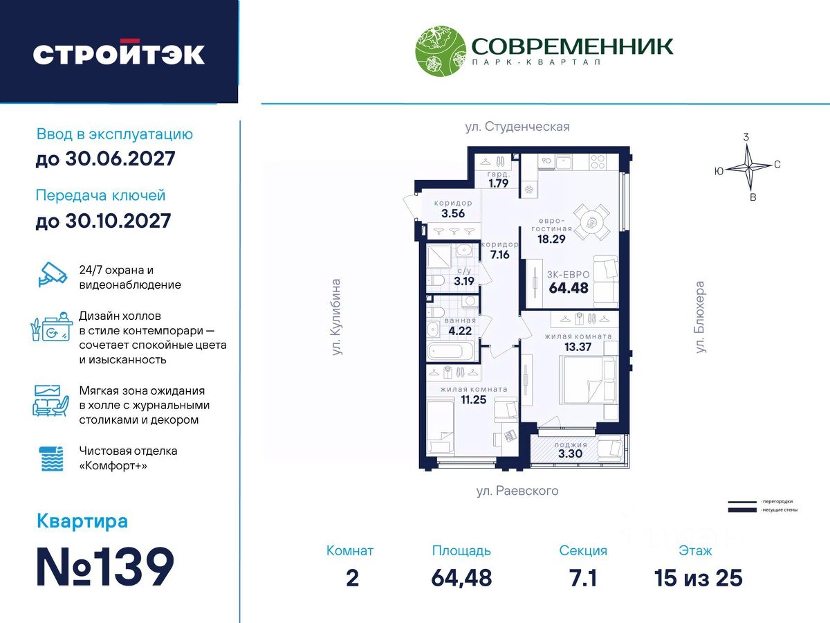 Время жить счастливо Современник — знаковый парк-квартал в интеллигентном районе Втузгородок, откуда недалеко до центра, а вблизи ведущие вузы и театры. Квартал состоит из 8 очередей строительства. Шесть очередей уже сданы и заселены; седьмая строится. В продаже квартиры от застройщика: 1 этап строящейся 7-й очереди. Объединяет квартал большой внутренний парк площадью в гектар — богатый прогулочными маршрутами, тенистыми деревьями, пространствами для отдыха, спорта и детских игр. С внешней стороны, у домов седьмой очереди, появится гостевой центр. Проект создавали в KCAP Architects & Planners, архитектурном бюро из Нидерландов, чьи работы украшают ландшафты Гамбурга, Роттердама, Антверпена и других городов Европы. Современные технологии, продуманное пространство и трендовый облик зданий создают размеренную и счастливую атмосферу для жизни здесь. Достойное окружение До проспекта Ленина на машине вы доберётесь за 10 минут, а с другой стороны, неподалёку — Шарташский лесопарк с озером Шарташ, которому около миллиона лет. Здесь для вас пляжи, лодочные станции, тропы для бега, спортивные площадки и кафе. В квартале уже работают супермаркеты, пекарни, салон красоты и не только. Ближние школы, гимназии и университеты помогут расправить крылья новым поколениям, а детские сады станут заботливой средой в начале пути. Кстати, на территории квартала спроектирован муниципальный детский сад на 200 мест. Выходите во двор Гуляйте по зелёным аллеям или устройтесь с книгой в гамаке. Займитесь воркаутом, футболом, баскетболом или пинг-понгом. Проводите семейные праздники под крытым амфитеатром или отправьте детей весело играть на насыщенный плейхаб. Мы всё предусмотрели. На закрытой территории без машин и посторонних спокойно и безопасно. Видеонаблюдение и освещение добавляют ещё больше уверенности. Впечатляющая доминанта у домов 7 очереди — новый гостевой центр: камерное пространство под навесом-перголой с озеленением и скамейками, чтобы встречать друзей или просто коротать вечер. Ваша зона комфорта Стильное лобби Современника мы выполним в эстетике contemporary: минимализм, сочетание дерева со штукатуркой и тёмным металлом, зеркала, витражи. Обстановка из мягкой мебели, растений и книг. Двери из холла выходят на обе стороны. Внутри — специальная комната для колясок и самокатов. На минус первом этаже подземный паркинг с 201 машино-местом, куда легко попасть на лифте прямо с вашего этажа. Здесь же можно приобрести одну из 67 кладовых, чтобы хранить сезонный инвентарь и крупную технику. СТРОЙТЭК возводит 7 очередь в 3 этапа. Дом с привилегиями Первый этап — секция 7.1, отдельная башня в 25 этажей. Здесь 246 квартир в 19 уникальных планировках от студий до 3-комнатных, в классических и евро-вариантах. Просторные кухни-гостиные, гардеробные и окна на 2 стороны — лишь часть их плюсов. В Современнике улучшенный стандарт отделки "Комфорт +". Помимо привычных комфортных сантехники и электрики, в него входят оконные стёкла Energy Light, которые помогают сохранять комфортну