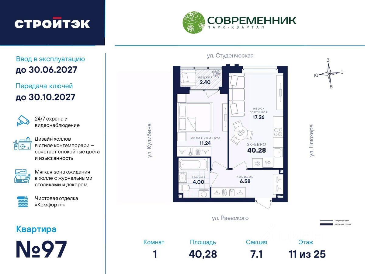 Время жить счастливо Современник — знаковый парк-квартал в интеллигентном районе Втузгородок, откуда недалеко до центра, а вблизи ведущие вузы и театры. Квартал состоит из 8 очередей строительства. Шесть очередей уже сданы и заселены; седьмая строится. В продаже квартиры от застройщика: 1 этап строящейся 7-й очереди. Объединяет квартал большой внутренний парк площадью в гектар — богатый прогулочными маршрутами, тенистыми деревьями, пространствами для отдыха, спорта и детских игр. С внешней стороны, у домов седьмой очереди, появится гостевой центр. Проект создавали в KCAP Architects & Planners, архитектурном бюро из Нидерландов, чьи работы украшают ландшафты Гамбурга, Роттердама, Антверпена и других городов Европы. Современные технологии, продуманное пространство и трендовый облик зданий создают размеренную и счастливую атмосферу для жизни здесь. Достойное окружение До проспекта Ленина на машине вы доберётесь за 10 минут, а с другой стороны, неподалёку — Шарташский лесопарк с озером Шарташ, которому около миллиона лет. Здесь для вас пляжи, лодочные станции, тропы для бега, спортивные площадки и кафе. В квартале уже работают супермаркеты, пекарни, салон красоты и не только. Ближние школы, гимназии и университеты помогут расправить крылья новым поколениям, а детские сады станут заботливой средой в начале пути. Кстати, на территории квартала спроектирован муниципальный детский сад на 200 мест. Выходите во двор Гуляйте по зелёным аллеям или устройтесь с книгой в гамаке. Займитесь воркаутом, футболом, баскетболом или пинг-понгом. Проводите семейные праздники под крытым амфитеатром или отправьте детей весело играть на насыщенный плейхаб. Мы всё предусмотрели. На закрытой территории без машин и посторонних спокойно и безопасно. Видеонаблюдение и освещение добавляют ещё больше уверенности. Впечатляющая доминанта у домов 7 очереди — новый гостевой центр: камерное пространство под навесом-перголой с озеленением и скамейками, чтобы встречать друзей или просто коротать вечер. Ваша зона комфорта Стильное лобби Современника мы выполним в эстетике contemporary: минимализм, сочетание дерева со штукатуркой и тёмным металлом, зеркала, витражи. Обстановка из мягкой мебели, растений и книг. Двери из холла выходят на обе стороны. Внутри — специальная комната для колясок и самокатов. На минус первом этаже подземный паркинг с 201 машино-местом, куда легко попасть на лифте прямо с вашего этажа. Здесь же можно приобрести одну из 67 кладовых, чтобы хранить сезонный инвентарь и крупную технику. СТРОЙТЭК возводит 7 очередь в 3 этапа. Дом с привилегиями Первый этап — секция 7.1, отдельная башня в 25 этажей. Здесь 246 квартир в 19 уникальных планировках от студий до 3-комнатных, в классических и евро-вариантах. Просторные кухни-гостиные, гардеробные и окна на 2 стороны — лишь часть их плюсов. В Современнике улучшенный стандарт отделки "Комфорт +". Помимо привычных комфортных сантехники и электрики, в него входят оконные стёкла Energy Light, которые помогают сохранять комфортну