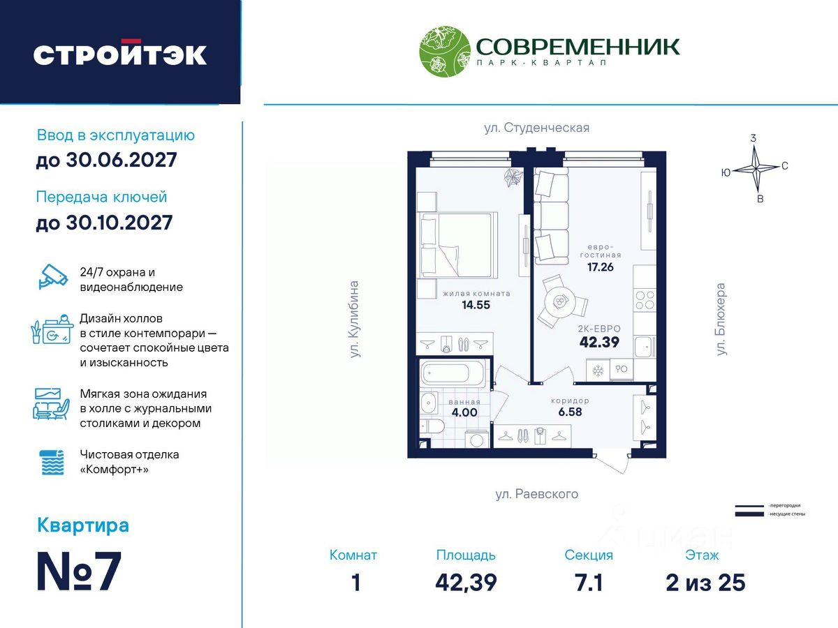 Время жить счастливо Современник — знаковый парк-квартал в интеллигентном районе Втузгородок, откуда недалеко до центра, а вблизи ведущие вузы и театры. Квартал состоит из 8 очередей строительства. Шесть очередей уже сданы и заселены; седьмая строится. В продаже квартиры от застройщика: 1 этап седьмой очереди. Объединяет квартал большой внутренний парк площадью в гектар — богатый прогулочными маршрутами, тенистыми деревьями, пространствами для отдыха, спорта и детских игр. С внешней стороны, у домов седьмой очереди, появится гостевой центр. Проект создавали в KCAP Architects and Planners, архитектурном бюро из Нидерландов, чьи работы украшают ландшафты Гамбурга, Антверпена и других городов Европы. Технологии, продуманное пространство и трендовый облик зданий создают размеренную атмосферу для жизни здесь. Достойное окружение До проспекта Ленина на машине вы доберётесь за 10 минут, а с другой стороны, неподалёку — Шарташский лесопарк с озером Шарташ, которому около миллиона лет. Здесь для вас пляжи, лодочные станции, тропы для бега и кафе. В квартале уже работают супермаркеты, пекарни, салон красоты и не только. Ближние школы, гимназии и университеты помогут расправить крылья новым поколениям, а детские сады станут заботливой средой в начале пути. Кстати, на территории квартала спроектирован муниципальный детский сад на 200 мест. Выходите во двор Гуляйте по зелёным аллеям или устройтесь с книгой в гамаке. Займитесь воркаутом, футболом, баскетболом или пинг-понгом. Проводите семейные праздники под крытым амфитеатром или отправьте детей играть на насыщенный плейхаб. Мы всё предусмотрели. На закрытой территории без машин и посторонних спокойно и безопасно. Видеонаблюдение и освещение добавляют ещё больше уверенности. Впечатляющая доминанта у домов 7 очереди — новый гостевой центр: камерное пространство под навесом-перголой с озеленением и скамейками, чтобы встречать друзей. Ваша зона комфорта Стильное лобби Современника мы выполним в эстетике contemporary: минимализм, сочетание дерева со штукатуркой и тёмным металлом, зеркала, витражи. Обстановка из мягкой мебели, растений и книг. Двери из холла выходят на обе стороны. Внутри — комната для колясок и самокатов. На -1 этаже подземный паркинг с 201 машино-местом, куда легко попасть на лифте прямо с вашего этажа. Здесь же можно приобрести одну из 67 кладовых, чтобы хранить сезонный инвентарь. СТРОЙТЭК возводит 7 очередь в 3 этапа. Дом с привилегиями Первый этап — секция 7.1, башня в 25 этажей. Здесь 246 квартир в 19 уникальных планировках от студий до 3-комнатных, в классических и евро-вариантах. Просторные кухни-гостиные, гардеробные и окна на 2 стороны — лишь часть их плюсов. В Современнике улучшенный стандарт отделки "Комфорт +". Помимо комфортных сантехники и электрики, в него входят оконные стёкла Energy Light, которые помогают сохранять температуру, прочный ламинат 33 класса и устойчивые к многократной покраске виниловые обои. Белые межкомнатные двери и плинтусы подчеркнут любую цветовую гамму.