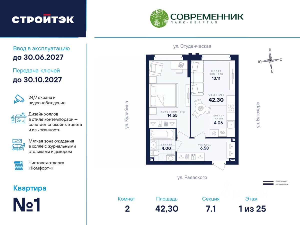Время жить счастливо Современник — знаковый парк-квартал в интеллигентном районе Втузгородок, откуда недалеко до центра, а вблизи ведущие вузы и театры. Квартал состоит из 8 очередей строительства. Шесть очередей уже сданы и заселены; седьмая строится. В продаже квартиры от застройщика: 1 этап строящейся 7-й очереди. Объединяет квартал большой внутренний парк площадью в гектар — богатый прогулочными маршрутами, тенистыми деревьями, пространствами для отдыха, спорта и детских игр. С внешней стороны, у домов седьмой очереди, появится гостевой центр. Проект создавали в KCAP Architects & Planners, архитектурном бюро из Нидерландов, чьи работы украшают ландшафты Гамбурга, Роттердама, Антверпена и других городов Европы. Современные технологии, продуманное пространство и трендовый облик зданий создают размеренную и счастливую атмосферу для жизни здесь. Достойное окружение До проспекта Ленина на машине вы доберётесь за 10 минут, а с другой стороны, неподалёку — Шарташский лесопарк с озером Шарташ, которому около миллиона лет. Здесь для вас пляжи, лодочные станции, тропы для бега, спортивные площадки и кафе. В квартале уже работают супермаркеты, пекарни, салон красоты и не только. Ближние школы, гимназии и университеты помогут расправить крылья новым поколениям, а детские сады станут заботливой средой в начале пути. Кстати, на территории квартала спроектирован муниципальный детский сад на 200 мест. Выходите во двор Гуляйте по зелёным аллеям или устройтесь с книгой в гамаке. Займитесь воркаутом, футболом, баскетболом или пинг-понгом. Проводите семейные праздники под крытым амфитеатром или отправьте детей весело играть на насыщенный плейхаб. Мы всё предусмотрели. На закрытой территории без машин и посторонних спокойно и безопасно. Видеонаблюдение и освещение добавляют ещё больше уверенности. Впечатляющая доминанта у домов 7 очереди — новый гостевой центр: камерное пространство под навесом-перголой с озеленением и скамейками, чтобы встречать друзей или просто коротать вечер. Ваша зона комфорта Стильное лобби Современника мы выполним в эстетике contemporary: минимализм, сочетание дерева со штукатуркой и тёмным металлом, зеркала, витражи. Обстановка из мягкой мебели, растений и книг. Двери из холла выходят на обе стороны. Внутри — специальная комната для колясок и самокатов. На минус первом этаже подземный паркинг с 201 машино-местом, куда легко попасть на лифте прямо с вашего этажа. Здесь же можно приобрести одну из 67 кладовых, чтобы хранить сезонный инвентарь и крупную технику. СТРОЙТЭК возводит 7 очередь в 3 этапа. Дом с привилегиями Первый этап — секция 7.1, отдельная башня в 25 этажей. Здесь 246 квартир в 19 уникальных планировках от студий до 3-комнатных, в классических и евро-вариантах. Просторные кухни-гостиные, гардеробные и окна на 2 стороны — лишь часть их плюсов. В Современнике улучшенный стандарт отделки "Комфорт +". Помимо привычных комфортных сантехники и электрики, в него входят оконные стёкла Energy Light, которые помогают сохранять комфортну
