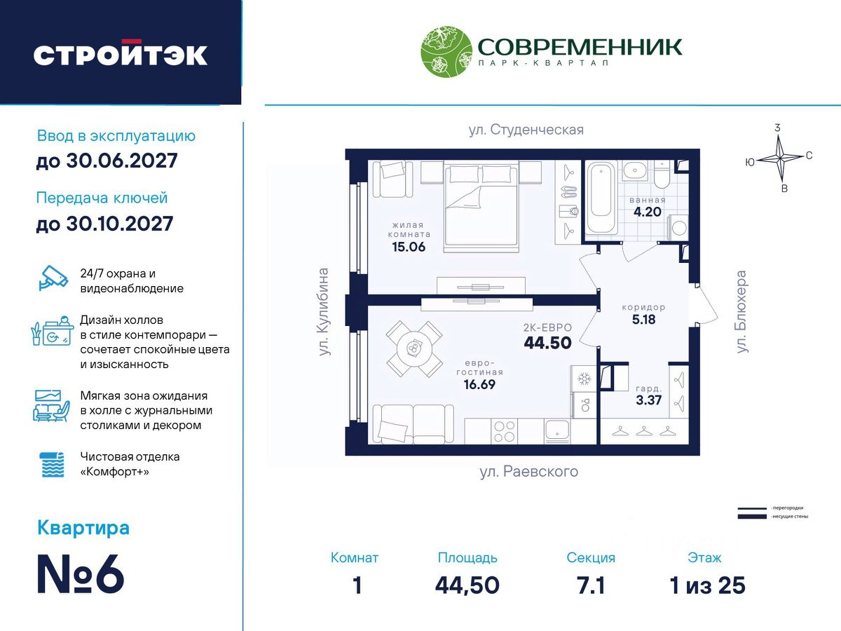 Время жить счастливо Современник — знаковый парк-квартал в интеллигентном районе Втузгородок, откуда недалеко до центра, а вблизи ведущие вузы и театры. Квартал состоит из 8 очередей строительства. Шесть очередей уже сданы и заселены; седьмая строится. В продаже квартиры от застройщика: 1 этап строящейся 7-й очереди. Объединяет квартал большой внутренний парк площадью в гектар — богатый прогулочными маршрутами, тенистыми деревьями, пространствами для отдыха, спорта и детских игр. С внешней стороны, у домов седьмой очереди, появится гостевой центр. Проект создавали в KCAP Architects & Planners, архитектурном бюро из Нидерландов, чьи работы украшают ландшафты Гамбурга, Роттердама, Антверпена и других городов Европы. Современные технологии, продуманное пространство и трендовый облик зданий создают размеренную и счастливую атмосферу для жизни здесь. Достойное окружение До проспекта Ленина на машине вы доберётесь за 10 минут, а с другой стороны, неподалёку — Шарташский лесопарк с озером Шарташ, которому около миллиона лет. Здесь для вас пляжи, лодочные станции, тропы для бега, спортивные площадки и кафе. В квартале уже работают супермаркеты, пекарни, салон красоты и не только. Ближние школы, гимназии и университеты помогут расправить крылья новым поколениям, а детские сады станут заботливой средой в начале пути. Кстати, на территории квартала спроектирован муниципальный детский сад на 200 мест. Выходите во двор Гуляйте по зелёным аллеям или устройтесь с книгой в гамаке. Займитесь воркаутом, футболом, баскетболом или пинг-понгом. Проводите семейные праздники под крытым амфитеатром или отправьте детей весело играть на насыщенный плейхаб. Мы всё предусмотрели. На закрытой территории без машин и посторонних спокойно и безопасно. Видеонаблюдение и освещение добавляют ещё больше уверенности. Впечатляющая доминанта у домов 7 очереди — новый гостевой центр: камерное пространство под навесом-перголой с озеленением и скамейками, чтобы встречать друзей или просто коротать вечер. Ваша зона комфорта Стильное лобби Современника мы выполним в эстетике contemporary: минимализм, сочетание дерева со штукатуркой и тёмным металлом, зеркала, витражи. Обстановка из мягкой мебели, растений и книг. Двери из холла выходят на обе стороны. Внутри — специальная комната для колясок и самокатов. На минус первом этаже подземный паркинг с 201 машино-местом, куда легко попасть на лифте прямо с вашего этажа. Здесь же можно приобрести одну из 67 кладовых, чтобы хранить сезонный инвентарь и крупную технику. СТРОЙТЭК возводит 7 очередь в 3 этапа. Дом с привилегиями Первый этап — секция 7.1, отдельная башня в 25 этажей. Здесь 246 квартир в 19 уникальных планировках от студий до 3-комнатных, в классических и евро-вариантах. Просторные кухни-гостиные, гардеробные и окна на 2 стороны — лишь часть их плюсов. В Современнике улучшенный стандарт отделки "Комфорт +". Помимо привычных комфортных сантехники и электрики, в него входят оконные стёкла Energy Light, которые помогают сохранять комфортну