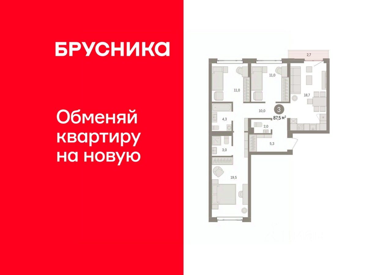 Просторная 3-комн. квартира с предчистовой отделкой в ЖК "Квартал Траектория" на 3 этаже. Общая площадь: 87.5 кв.м., жилая: 41.5 кв.м., площадь просторной кухни-столовой: 18.7 кв.м. Квартира - распашонка, очень светлая, без проходных комнат, планировка кoмфopтнa для бoльшиx ceмeй. В квартире один балкон, два совмещенных санузла. Высота потолков 2.82 м.