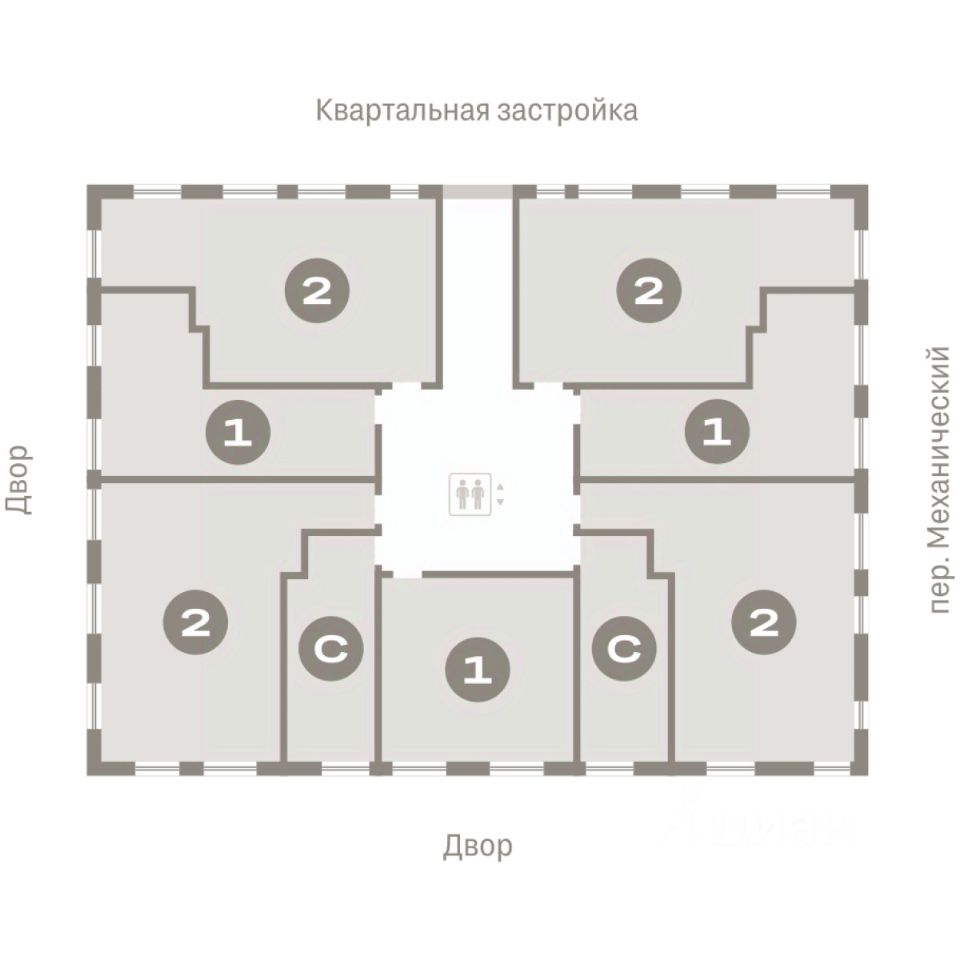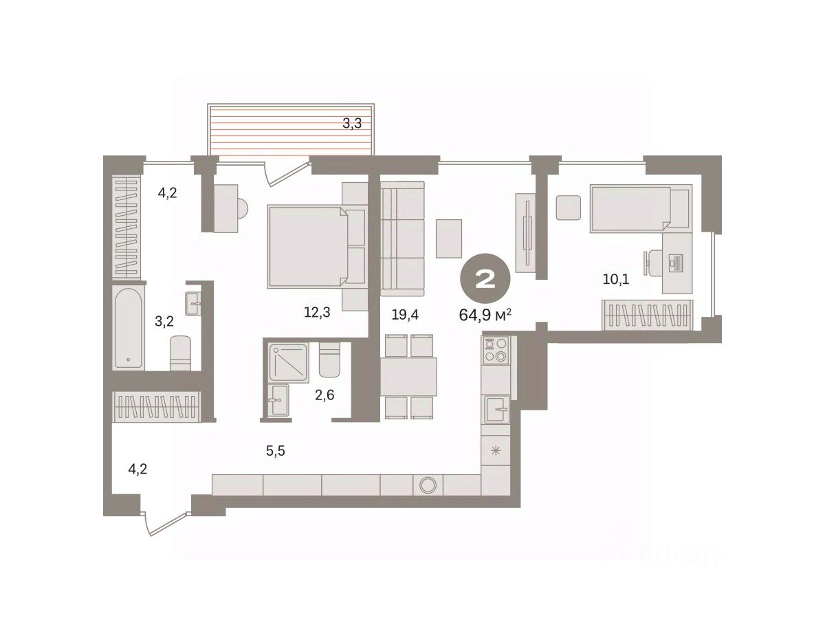 Квартира с кухней-гостиной и двумя спальнями в Северном квартале. Особенности планировки: гардеробная, вид во двор, разнесённые спальни, предчистовая отделка, мастер-спальня, балкон.