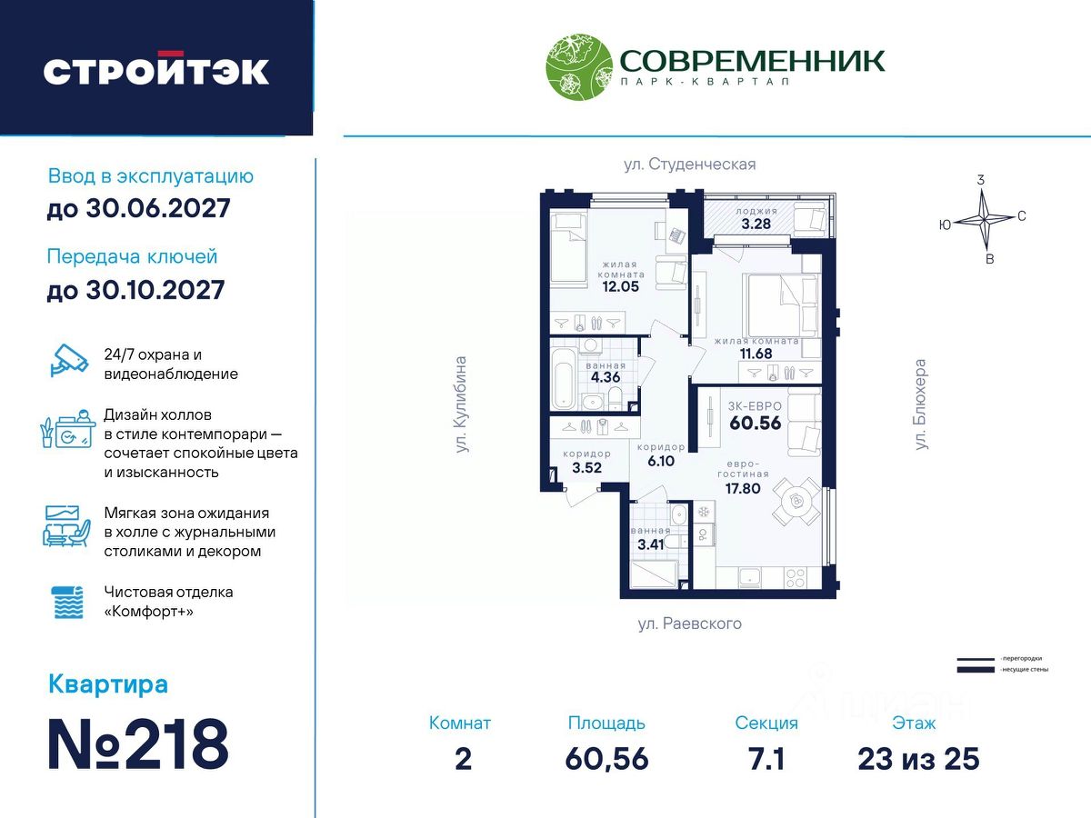 Время жить счастливо Современник — знаковый парк-квартал в интеллигентном районе Втузгородок, откуда недалеко до центра, а вблизи ведущие вузы и театры. Квартал состоит из 8 очередей строительства. Шесть очередей уже сданы и заселены; седьмая строится. В продаже квартиры от застройщика: 1 этап строящейся 7-й очереди. Объединяет квартал большой внутренний парк площадью в гектар — богатый прогулочными маршрутами, тенистыми деревьями, пространствами для отдыха, спорта и детских игр. С внешней стороны, у домов седьмой очереди, появится гостевой центр. Проект создавали в KCAP Architects and Planners, архитектурном бюро из Нидерландов, чьи работы украшают ландшафты Гамбурга, Роттердама, Антверпена и других городов Европы. Современные технологии, продуманное пространство и трендовый облик зданий создают размеренную и счастливую атмосферу для жизни здесь. Достойное окружение До проспекта Ленина на машине вы доберётесь за 10 минут, а с другой стороны, неподалёку — Шарташский лесопарк с озером Шарташ, которому около миллиона лет. Здесь для вас пляжи, лодочные станции, тропы для бега, спортивные площадки и кафе. В квартале уже работают супермаркеты, пекарни, салон красоты и не только. Ближние школы, гимназии и университеты помогут расправить крылья новым поколениям, а детские сады станут заботливой средой в начале пути. Кстати, на территории квартала спроектирован муниципальный детский сад на 200 мест. Выходите во двор Гуляйте по зелёным аллеям или устройтесь с книгой в гамаке. Займитесь воркаутом, футболом, баскетболом или пинг-понгом. Проводите семейные праздники под крытым амфитеатром или отправьте детей весело играть на насыщенный плейхаб. Мы всё предусмотрели. На закрытой территории без машин и посторонних спокойно и безопасно. Видеонаблюдение и освещение добавляют ещё больше уверенности. Впечатляющая доминанта у домов 7 очереди — новый гостевой центр: камерное пространство под навесом-перголой с озеленением и скамейками, чтобы встречать друзей или просто коротать вечер. Ваша зона комфорта Стильное лобби Современника мы выполним в эстетике contemporary: минимализм, сочетание дерева со штукатуркой и тёмным металлом, зеркала, витражи. Обстановка из мягкой мебели, растений и книг. Двери из холла выходят на обе стороны. Внутри — специальная комната для колясок и самокатов. На минус первом этаже подземный паркинг с 201 машино-местом, куда легко попасть на лифте прямо с вашего этажа. Здесь же можно приобрести одну из 67 кладовых, чтобы хранить сезонный инвентарь и крупную технику. СТРОЙТЭК возводит 7 очередь в 3 этапа. Дом с привилегиями Первый этап — секция 7.1, отдельная башня в 25 этажей. Здесь 246 квартир в 19 уникальных планировках от студий до 3-комнатных, в классических и евро-вариантах. Просторные кухни-гостиные, гардеробные и окна на 2 стороны — лишь часть их плюсов. В Современнике улучшенный стандарт отделки "Комфорт +". Помимо привычных комфортных сантехники и электрики, в него входят оконные стёкла Energy Light, которые помогают сохранять комфорт