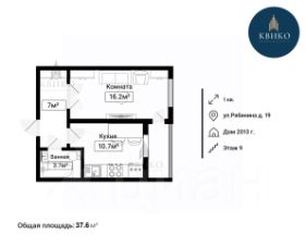 1-комнатная квартира: общая площадь - 37,6 м, кухня - 10,7 м, просторная комната - 16,2 м и коридор 7 м, с/у - 3,7 м