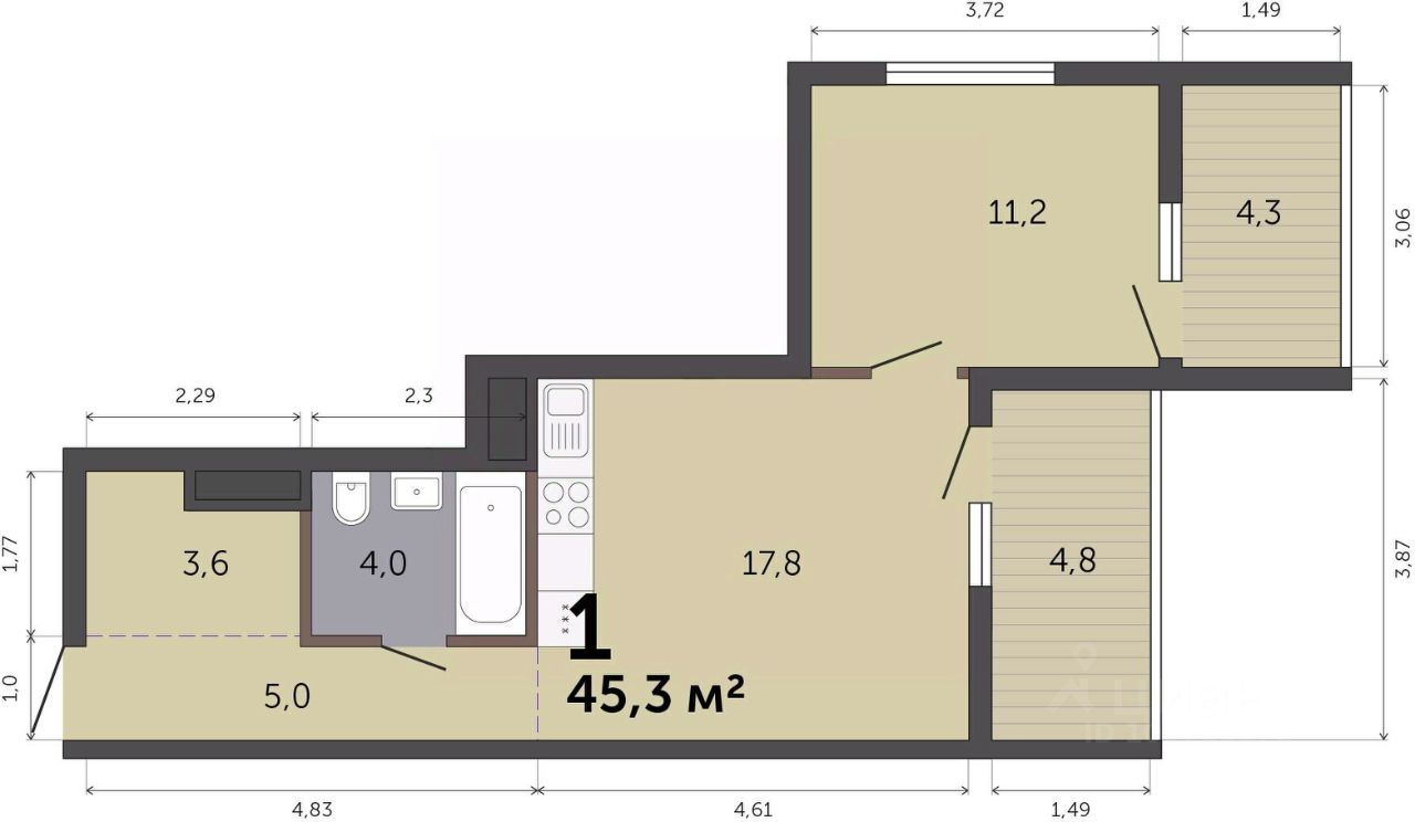 Продаётся 1-комнатная квартира в строящемся доме (Дом 6), срок сдачи: III-кв. 2027, общей площадью 45.3 кв.м., на 4 этаже.  Расположение, транспортная доступность