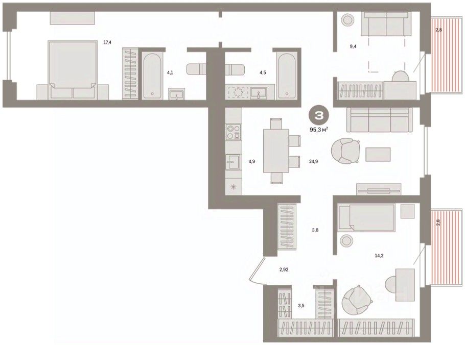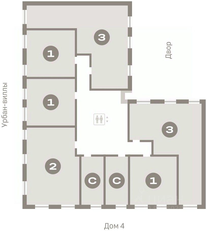 Квартира с кухней-гостиной и тремя спальнями в Южных кварталах. Особенности планировки: окна на две стороны, гардеробная, вид во двор, разнесённые спальни, предчистовая отделка, мастер-спальня, балкон.