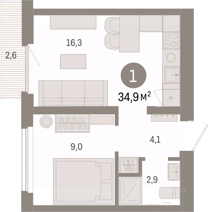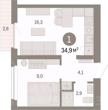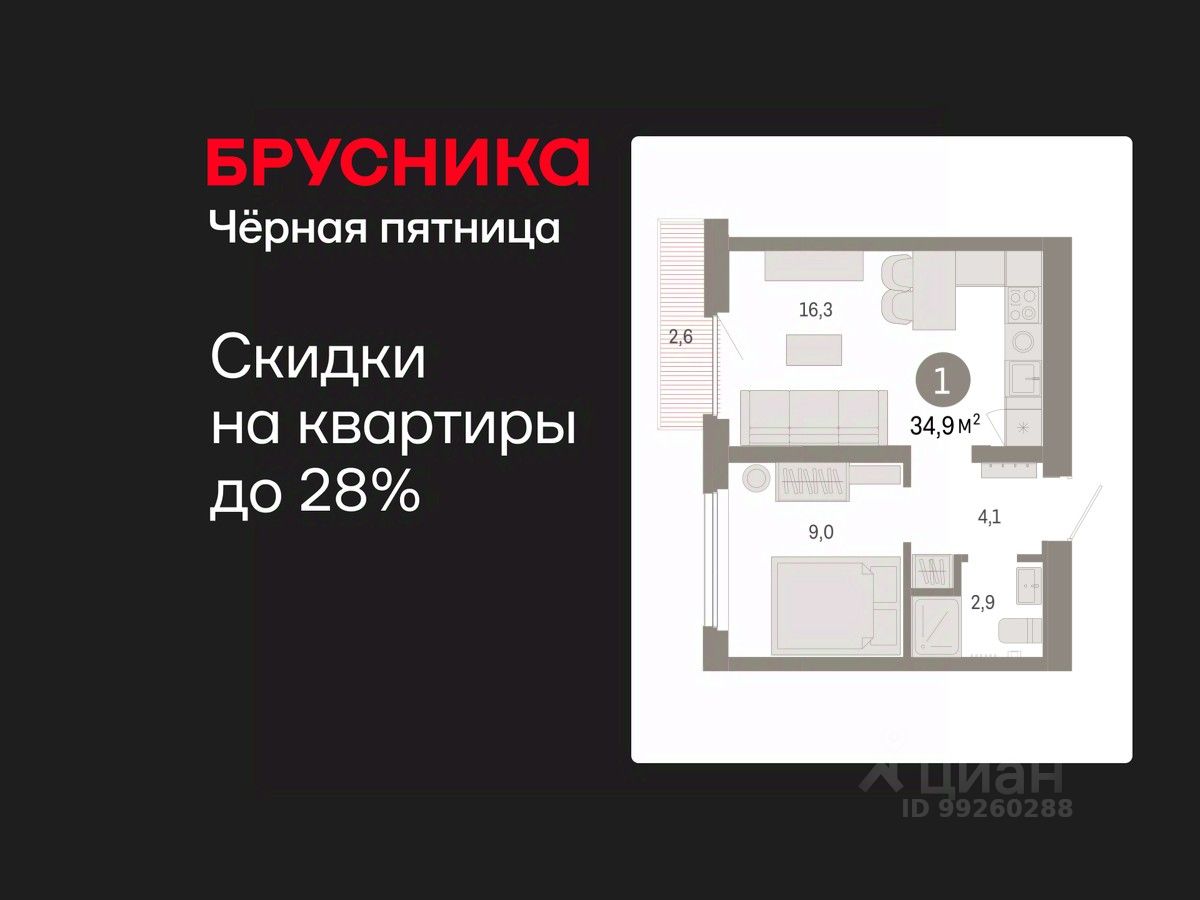 Квартира с кухней-гостиной и одной спальней в Бруснике в Академическом. Особенности планировки: вид во двор, предчистовая отделка, балкон.