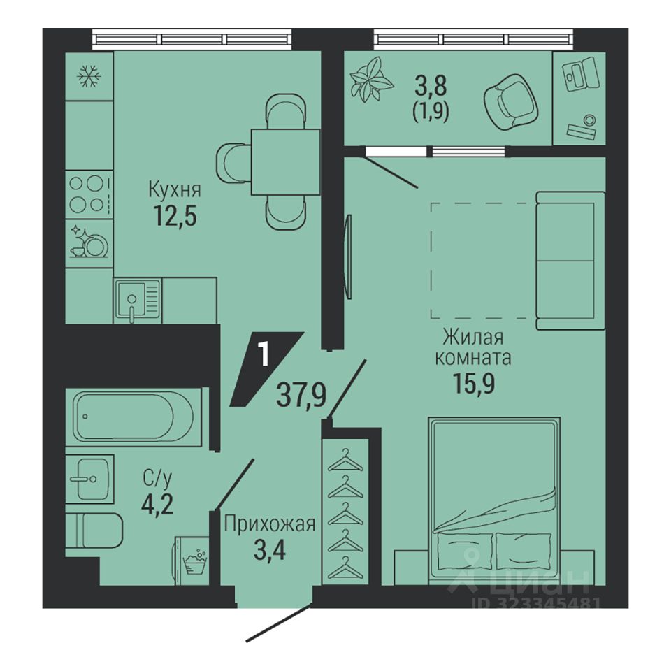 Общая площадь37,9 м²