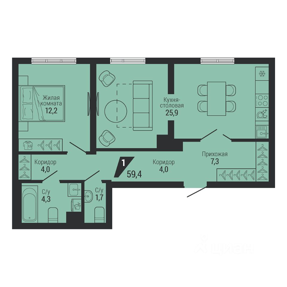Общая площадь59,4 м²