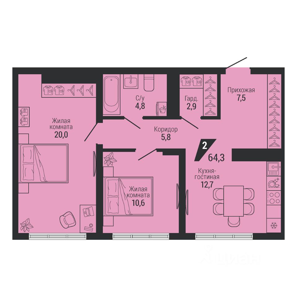 Общая площадь64,3 м²