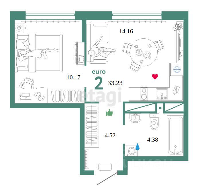 Евро Двушка (спальня и кухня-гостиная) на 4 этаже.