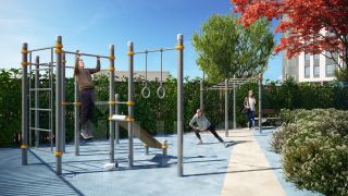 Двор без машин. Игровые площадки для детей разных возрастов, места отдыха и занятий спортом для взрослых не соседствуют с парковкой.
