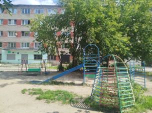 Во дворе детская площадка. Имеются парковочные места для автомобилей.
