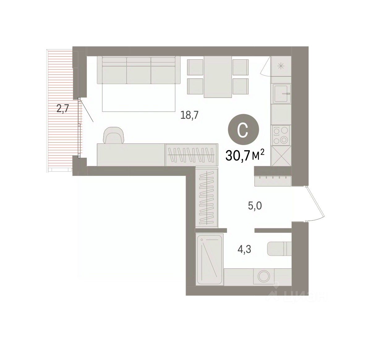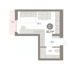 Однокомнатная студия с предчистовой отделкой в ЖК "Квартал Траектория" на 3 этаже. Общая площадь: 30.7 кв.м. Высота потолков 2.82 м.
