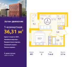 1-комн. квартира от застройщика с предчистовой отделкой в ЖК "Астон.Движение" на 7 этаже. Общая площадь: 36.31 кв.м., жилая: 12.3 кв.м., площадь просторной кухни-столовой: 14.3 кв.м. Все окна выходят на одну сторону. В квартире одна лоджия, один совмещенный санузел. Высота потолков 2.7 м.