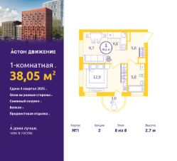1-комн. квартира с предчистовой отделкой в ЖК "Астон.Движение" на 8 этаже. Общая площадь: 38.05 кв.м., жилая: 12.9 кв.м., площадь просторной кухни-столовой: 14.3 кв.м. Квартира угловая, окна oбecпeчивaют paвнoмepнoe ocвeщeниe в тeчeниe дня. В квартире один балкон, один совмещенный санузел. Высота потолков 2.7 м.