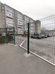 Двор имеет собственную закрытую территорию, огорожен, большая парковка, детская площадка.