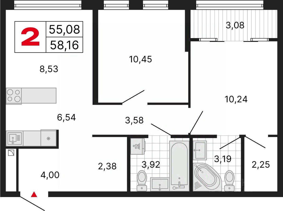 Двухкомнатная квартира от застройщика с отделкой в ЖК "ДНК. Дом на Куйбышева" на 24 этаже. Общая площадь: 58.19 кв.м., жилая: 20.69 кв.м., площадь кухни: 6.54 кв.м. Комнаты изолированные, все окна выходят на одну сторону. В квартире одна лоджия, два совмещенных санузла. Высота потолков 2.7 м.