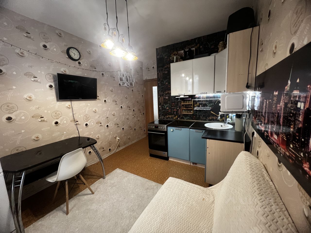 Поклеены обои , на полу хорошего качества линолеум . Планировка очень удобная , большая комната и вместительная кухня с выходом на лоджию . Останется мебель: куханный гарнитур , плита , кондиционер и большой шкаф в виде гардеробной . Район со свой управляющей компанией, горячую воду не когда не отключают , счетчики автоматически передают показания , везде видео наблюдение ! Рядом очень много детских садов, школ , магазинов , аптек, торговый центр , парк Удобная развязка , разнообразны вид транспорта и до трамвайной остановки 5 минут. Один взрослый собственник .
