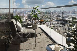 В квартире большая кухня-гостиная 43 м2, две спальни с гардеробными и санузлами,  постирочная. Высокие потолки и увеличенные оконные проемы наполняют пространство светом и воздухом. Планировка идеально подходит для семьи  из двух взрослых или  с одним ребенком — у каждого будет достаточно личного пространства.