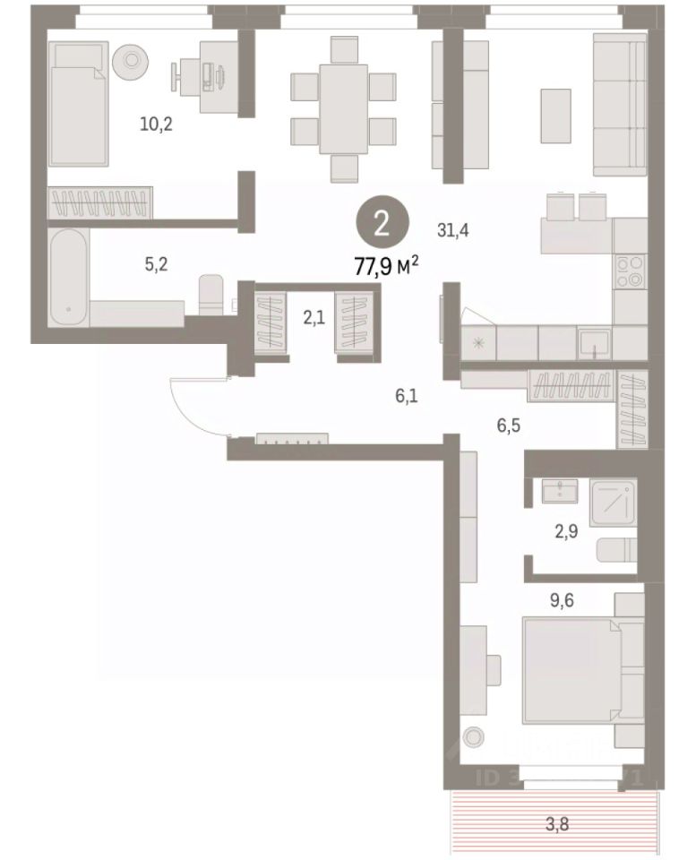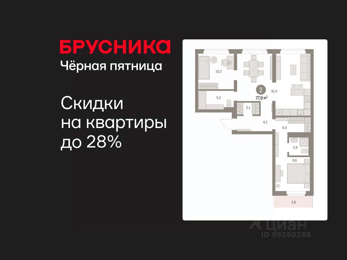 Квартира с кухней-гостиной и двумя спальнями в Бруснике в Академическом. Особенности планировки: второй санузел, гардеробная, вид во двор, разнесённые спальни, предчистовая отделка, мастер-спальня, терраса на крыше.