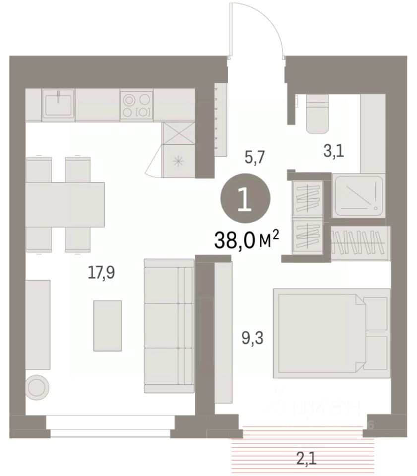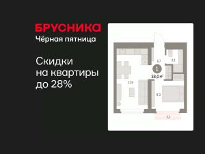 Квартира с кухней-гостиной и одной спальней в Бруснике в Академическом. Особенности планировки: предчистовая отделка, балкон.