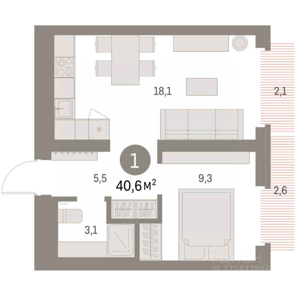 Квартира с кухней-гостиной и одной спальней в Бруснике в Академическом. Особенности планировки: предчистовая отделка, балкон.