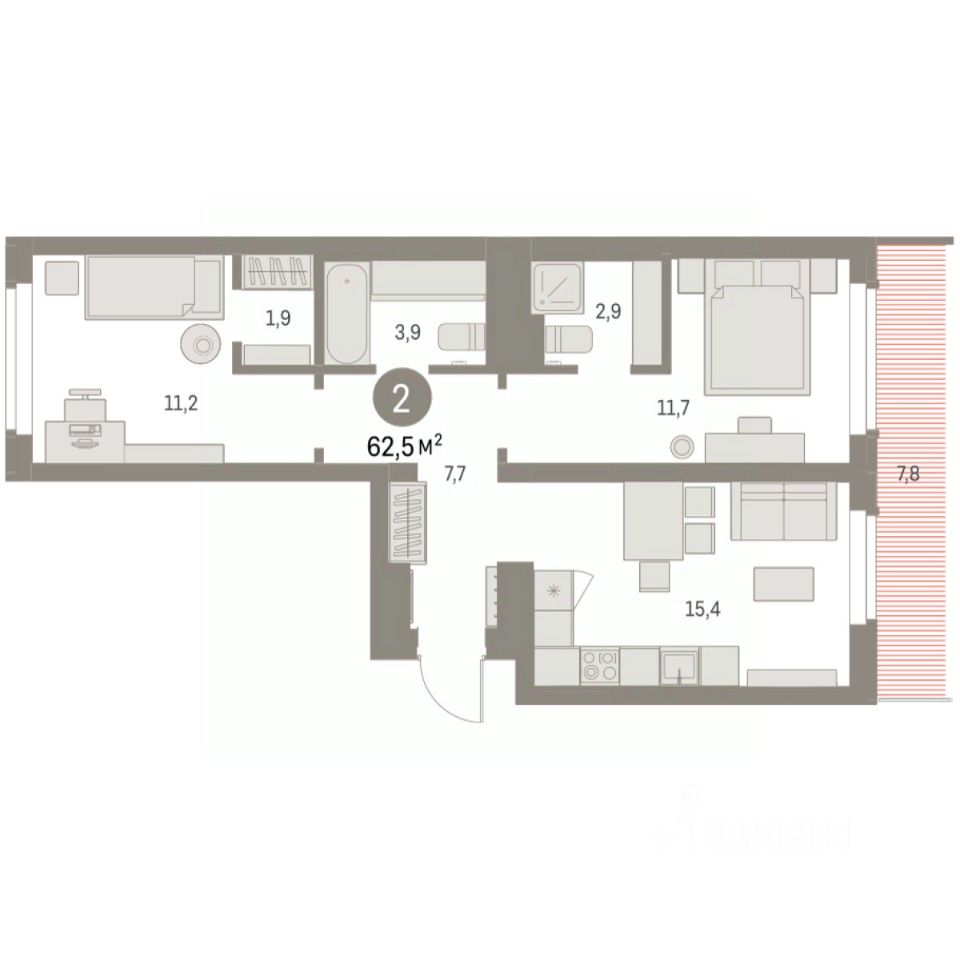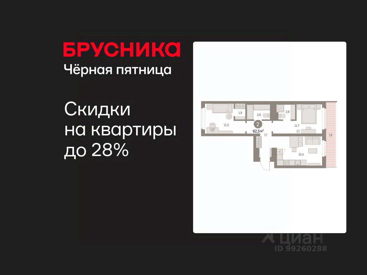 Квартира с кухней-гостиной и двумя спальнями в Бруснике в Академическом. Особенности планировки: второй санузел, гардеробная, вид во двор, разнесённые спальни, предчистовая отделка, мастер-спальня, терраса на крыше.