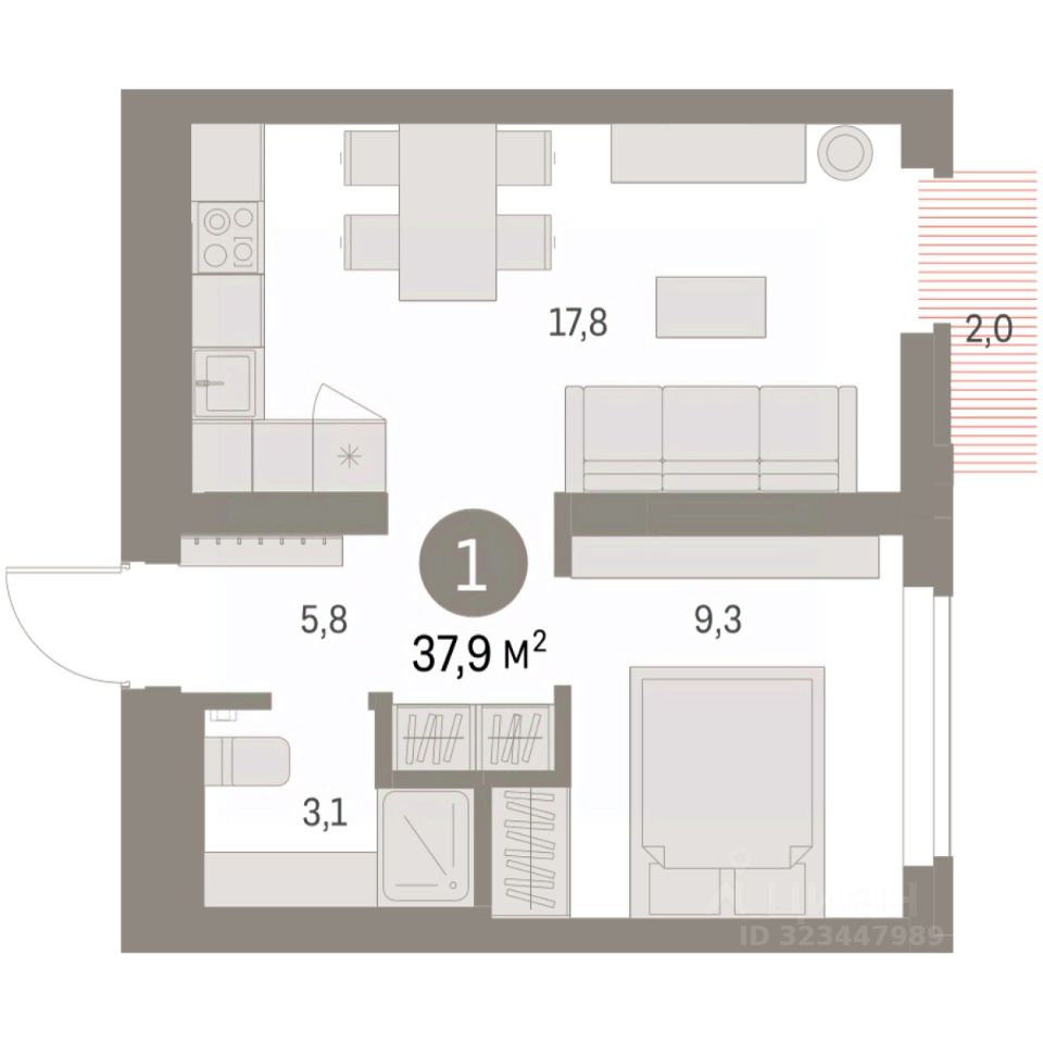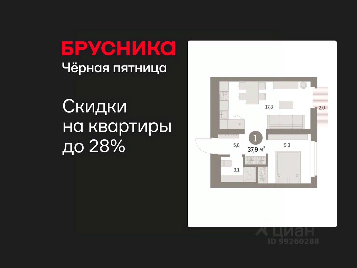 Квартира с кухней-гостиной и одной спальней в Бруснике в Академическом. Особенности планировки: предчистовая отделка, балкон.