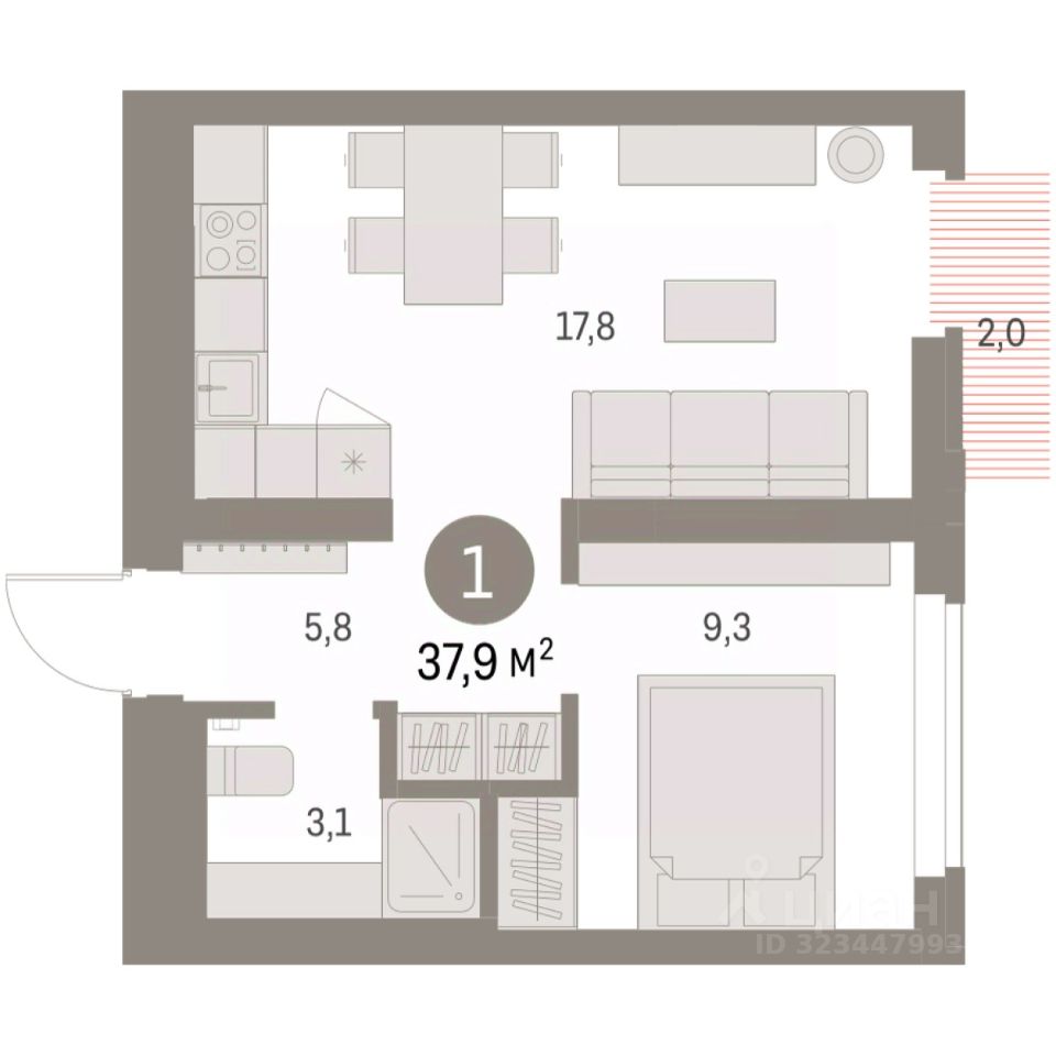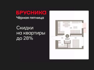Квартира с кухней-гостиной и одной спальней в Бруснике в Академическом. Особенности планировки: предчистовая отделка, балкон.