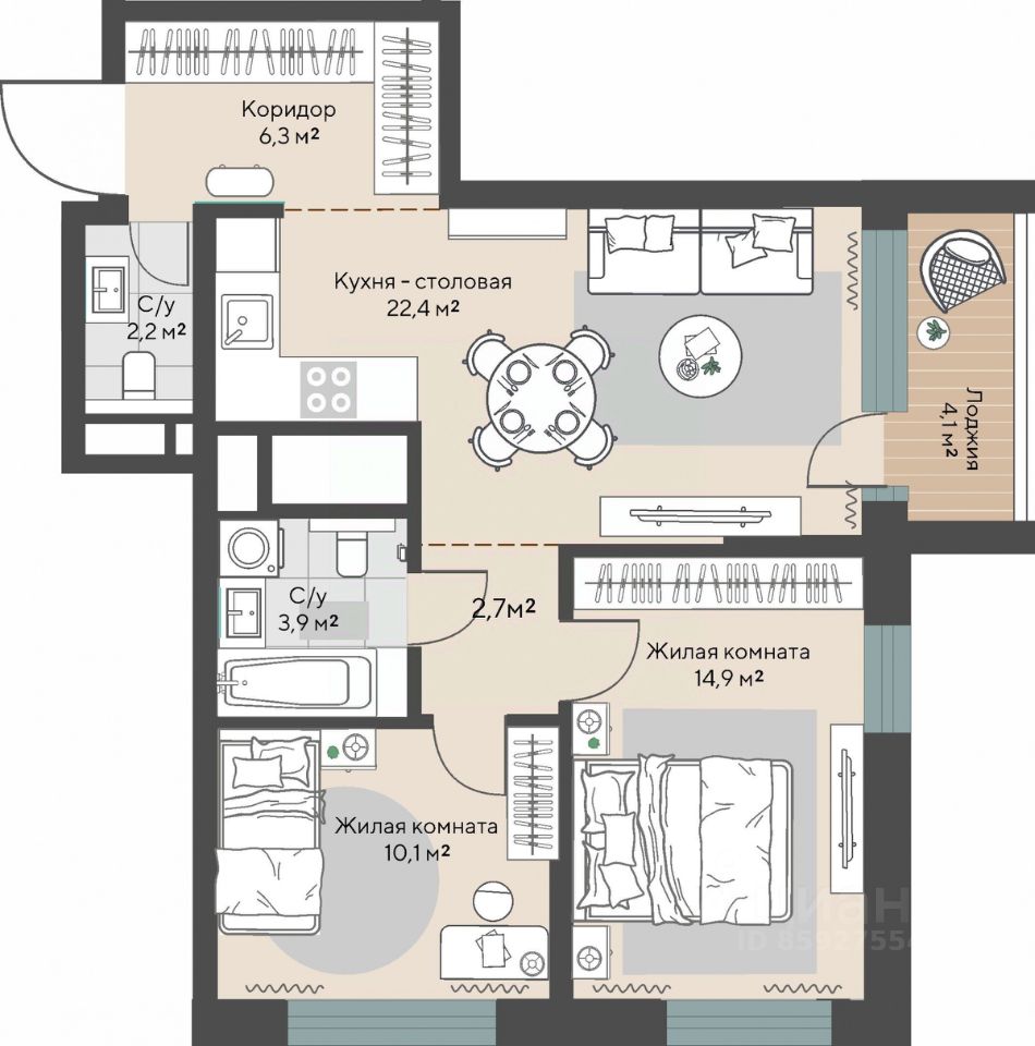 Продаётся 2-комнатная квартира в строящемся доме (Дом 1 этап 1.1), срок сдачи: I-кв. 2028, общей площадью 64.6 кв.м., на 24 этаже.
