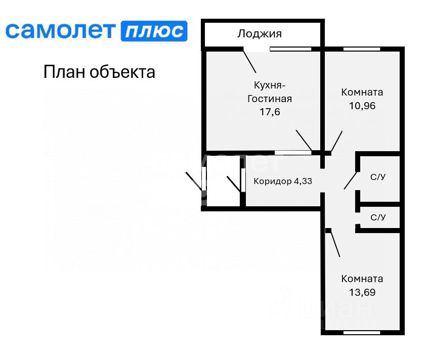 Функциональная планировка: большая кухня-гостиная (17,6 кв.м.) с выходом на застекленную лоджию идеальное место для семейных ужинов и приема гостей, а также две изолированные спальни (11 и 14 кв.м.)