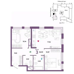 Продается 3комнатная квартира на 12 этаже от застройщика Страна Девелопмент. Площадь квартиры 56,03 кв. м. Стоимость указана без учета акций.