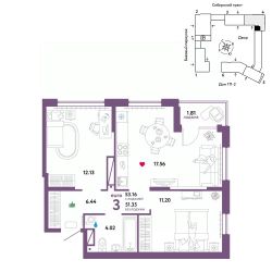 Продается 3комнатная квартира на 19 этаже от застройщика Страна Девелопмент. Площадь квартиры 53,16 кв. м. Стоимость указана без учета акций.
