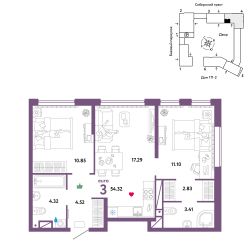 Продается 3комнатная квартира на 17 этаже от застройщика Страна Девелопмент. Площадь квартиры 54,32 кв. м. Стоимость указана без учета акций.
