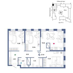Продается 4комнатная квартира на 26 этаже от застройщика Страна Девелопмент. Площадь квартиры 67,49 кв. м. Стоимость указана без учета акций.