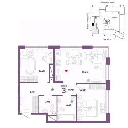 Продается 3комнатная квартира на 17 этаже от застройщика Страна Девелопмент. Площадь квартиры 55,9 кв. м. Стоимость указана без учета акций.