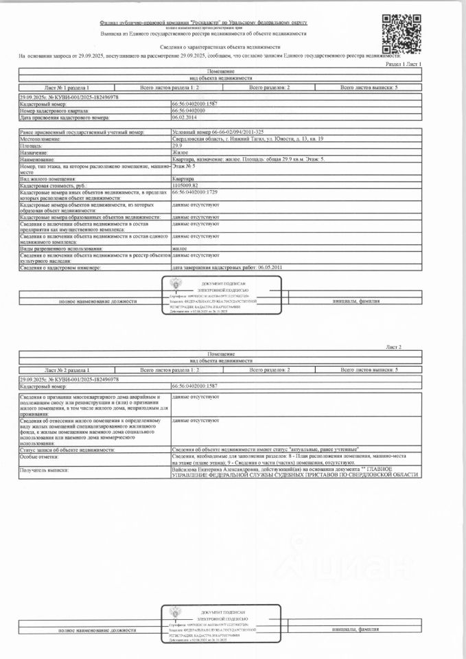 Должник: Одиноков И.Ю., собственник: Одиноков И.Ю. Лот: Жилое помещение (квартира), площадь 29,9 кв.м., кадастровый номер: 66:56:0402010:1587, г. Нижний Тагил, ул. Юности, д. 13, кв. 19 (зарегистрированные лица - 2 взрослых), н/ц: 900000 р, з-к: 900 р, код: 0014, рег. 08-2634/25;