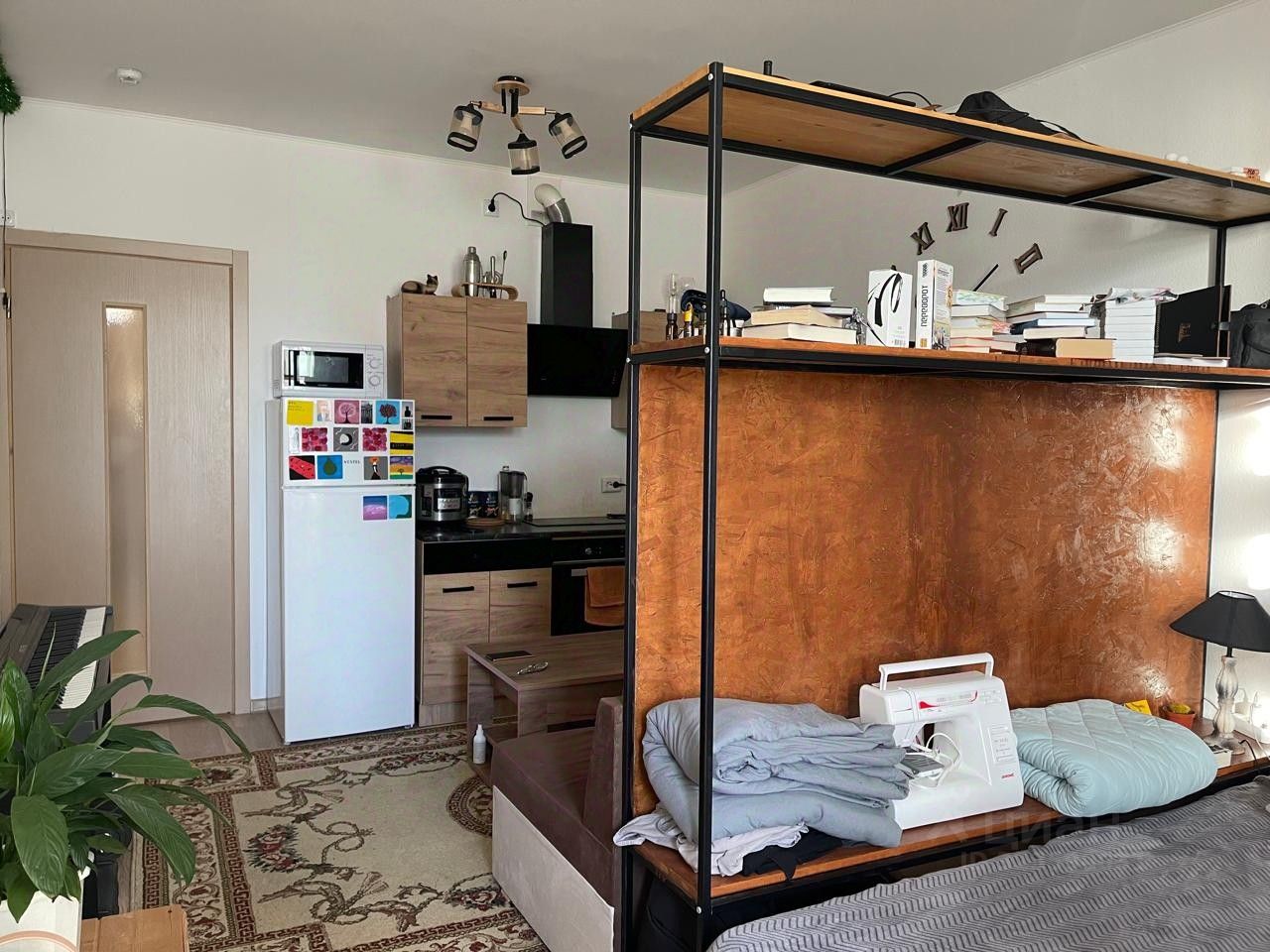 Квартира расположена на шестом этаже, окнами на юго-восток с видом во двор. Теплая светлая. Пространство зонировано на кухню и спальное место. В прихожей установлен вместительный шкаф-купе.