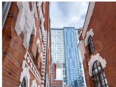 Далее за стилобатом вид открывается на зеленую зону соседнего двора, а вдали на Мамина-Сибиряка будет скоро построен современный красивый жилой комплекс, что только улучшит этот прекрасный вид.