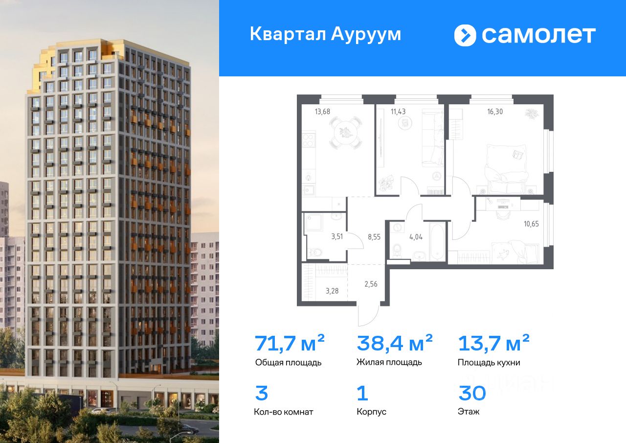 Строим кварталы для жизни с заботой о будущем. Предлагается 3-комнатная квартира бизнес-класса 71,7 кв.м в корпусе 1 на 30 этаже, в ЖК "Квартал Ауруум"